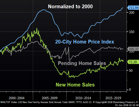 In Manufacturing, Kansas City Manufacturing numbers missed, as did Durable Goods Orders ex Transportation and QoQ Annualized GDP. However, both Dallas Manufacturing and the Chicago Purchasing Managers indexes beat, with Dallas reporting “The robust expansion in Texas factory activity continued in July” and Chicago’s Prices Paid index rising to the highest level since September 2008.