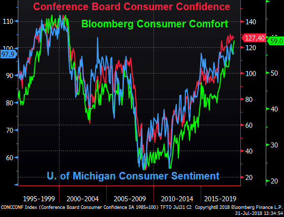 For the consumer, University of Michigan Consumer Sentiment beat expectations, as “consumers have kept their confidence at high levels due to favorable job and income prospects”. Bloomberg’s Consumer Comfort Index hit levels last seen in 2000, and The Conference Board also reported high levels of consumer confidence, with a caveat: “Consumers’ assessment of present-day conditions improved, suggesting that economic growth is still strong. However, while expectations continue to reflect optimism in the short-term economic outlook, back-to-back declines suggest consumers do not foresee growth accelerating.”