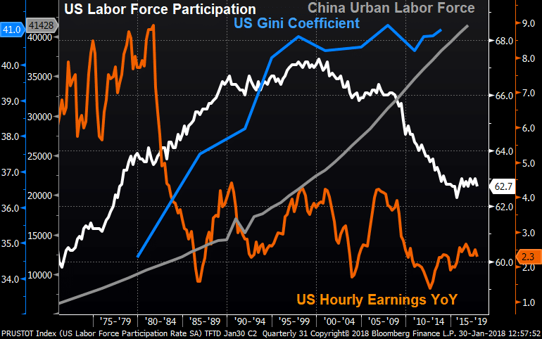 With yields showing some spunk recently and working back to test a long-term trendline, as shown in the chart at right, it seems that every talking head has opined on the move. Most of the commentary has been focused on short-term explanations, from politics to an uptick in growth. However, a remarkable paper from the BIS takes a different tack, and following the old adage that “demographics are destiny” asserts, in its title no less, that “Demographics will reverse three multi-decade global trends”. Particularly, the paper discusses how “As the world ages, real interest rates will rise, inflation and wage growth will pick up and inequality will fall”