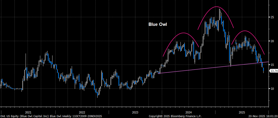 It’s been an incredibly interesting news week for those of us who focus on the nexus of markets and politics. This publication is often a little self-indulgent because it aims to read (and sometimes write) between the lines on recent financial/economic/political events. That’s precisely why we enjoy writing it! But first off, a little comedy. Blue Owl demonstrated the joy of unintentional irony by suffering a run on its Blue Owl Capital Corporation II. Readers may recall Jamie Dimon’s comments on pest control: “When you see one cockroach, there are probably more”. At the time, we were curious about Blue Owl’s co-CEO Marc Lipshultz’s evident irritation with Dimon’s remarks (described aptly as sly jabs in one piece); “an odd kind of fear-mongering” and “I guess he’s saying there might be a lot more cockroaches at JPMorgan.” Well, now we know. Blue Owl has experienced redemption requests that exceeded the quarterly liquidity it offered its investors. The fund proposed a deal where investors in the open-ended (untraded) fund would be merged with its closed end fund. Unfortunately, the closed end fund trades at a 20% discount to NAV, which didn’t exactly entice investors in the smaller open fund. The net effect was a sharp drop in Blue Owl’s stock price, which resulted in management scrapping the proposed merger and going back to the drawing board. Good luck with that.