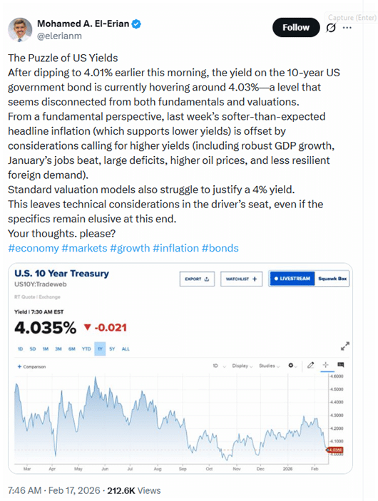 - It’s possible that investors’ understanding of the Fed reaction function might have shifted with Warsh’s appointment. Might Mr Warsh take a different view of how “robust GDP growth, January’s jobs beat, large deficits, higher oil prices, and less resilient foreign demand” should feed into the optimal policy rate?