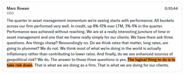 Do these “symptoms” suggest a specific course of “treatment” for thoughtful investors? In this question, we defer to Apollo’s Marc Rowan, who was kind enough to share some of his thoughts in their recent earnings call.